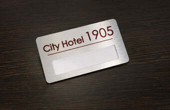 Меньшей популярностью пользуются пластиковые модели. Процесс их изготовления нельзя назвать слишком сложным, надпись и логотип на пластиковый фрагмент наносится с помощью лазера, используется метод гравировки. Цветной логотип на двухслойный пластик наносится методом шелкографии, этот вариант является более бюджетным и смотрится несомненно хуже, чем металлические бейджики с логотипом.